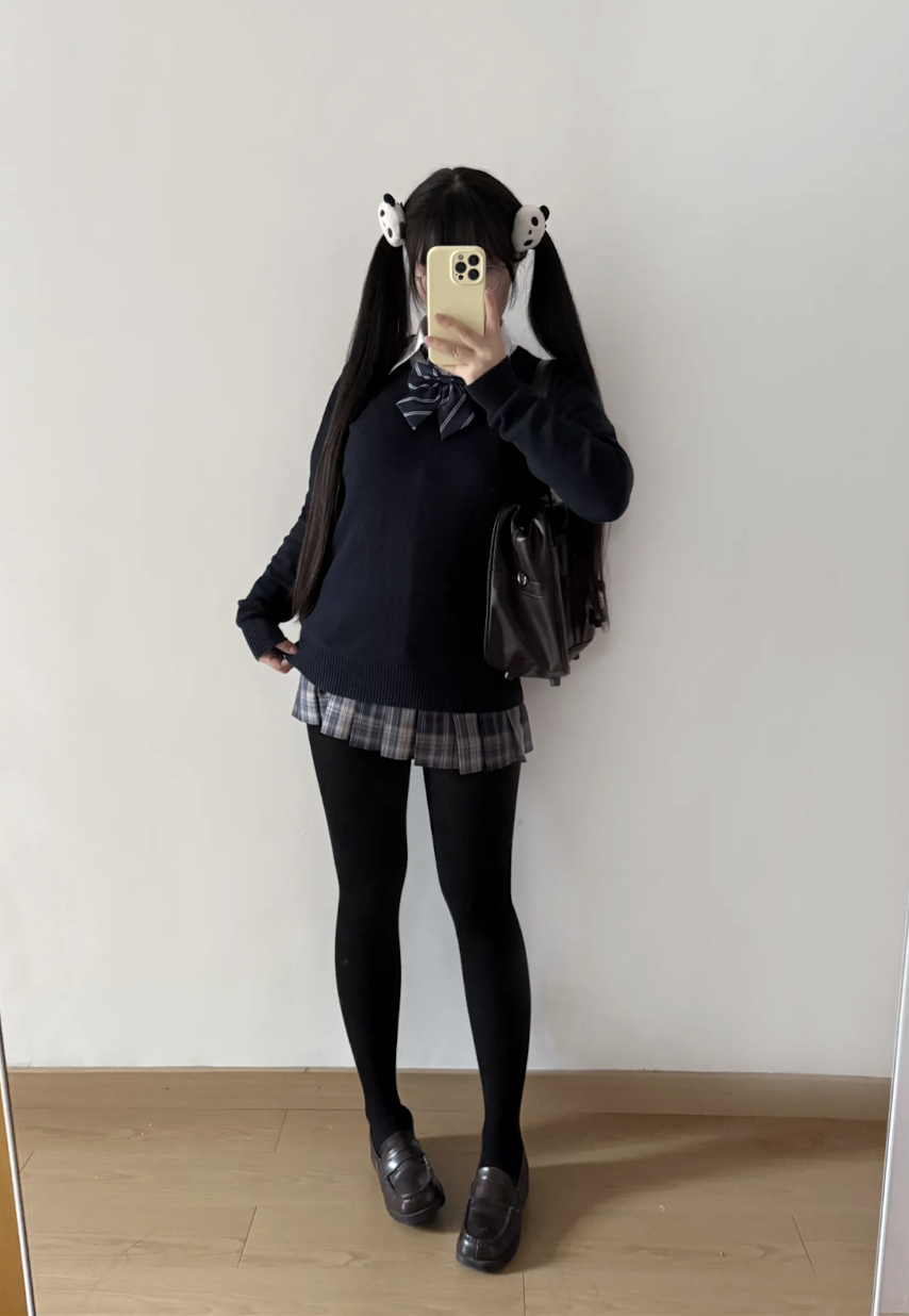 服装:深海军蓝(近黑)宽松细针织毛衣,内搭露出尖领的白衬衫(领子上有小字刺绣:Jackywine),水手服蓝斜纹领结,灰色+海军蓝格子百褶短裙,纯黑色不透明超厚哑光连裤袜,深棕色抛光皮革圆头乐福鞋